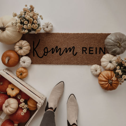 Endlich schöne Fußmatten aus hochwertigen Kokosfasern! Ist das nicht ein toller Empfang? Zaubert euren Gästen ein Lächeln ins Gesicht mit unseren Fußmatten. Die fein geschwungenen und handgeschriebenen Schriftzüge verleihen unseren Fußmatten einen edlen und modernen Touch. Die Vorderseite besteht aus einer naturbelassenen Oberflächenstruktur aus 100% Kokosfasern. Die Rückseite besteht aus rutschfestem Vinyl, was die Fußmatte sicher an ihrem vorgesehenen Ort fixiert. Das Format von 45 x 70 cm ist ideal für jeden Indoor Eingangsbereich!